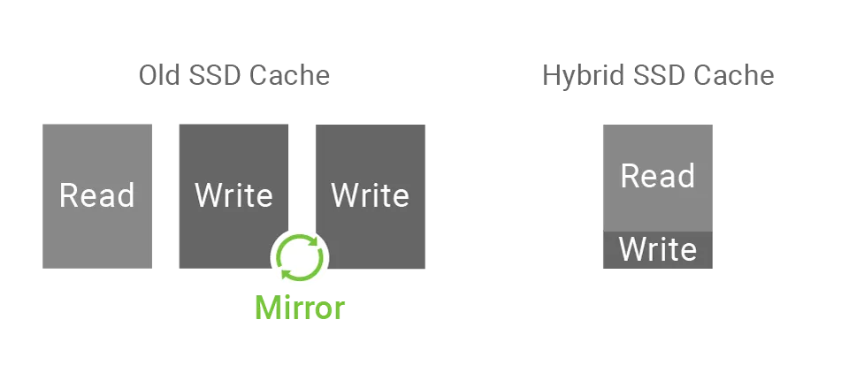Với bộ nhớ đệm SSD lai, QSAN sử dụng các thuật toán và phép thử chuyên sâu để phân chia không gian SSD thành hai phần: bộ đệm đọc và bộ đệm ghi, từ đó tối ưu hóa hiệu suất và hiệu quả hệ thống.